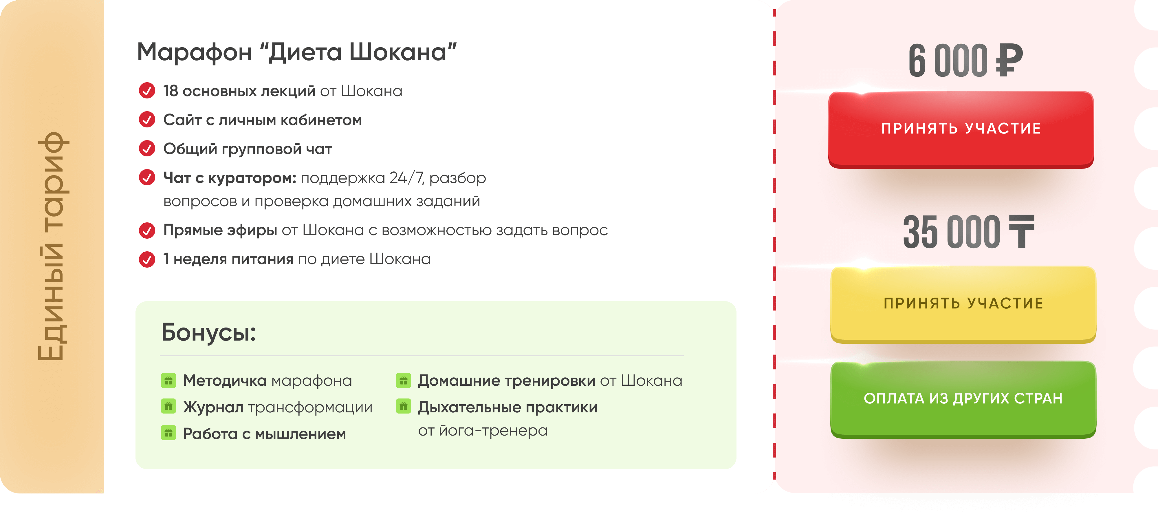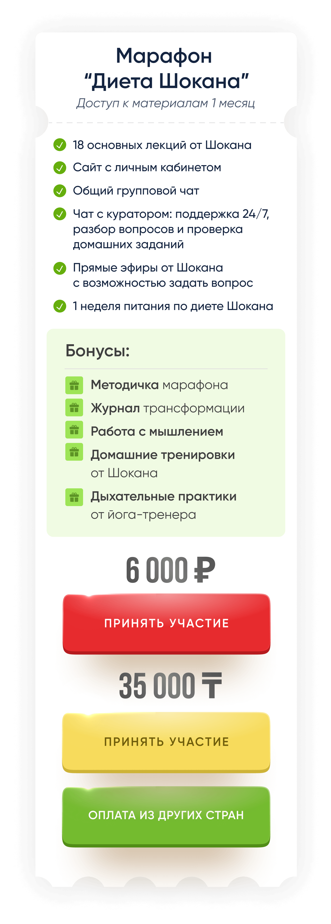 Во время прохождения марафона вы будете получать поддержку от Шокана, кураторов и единомышленников. Более того, мы дадим вам лайфхаки, что делать, в случае появления чувства голода, головной боли или слабости. Это комплексная работа с мышлением, пищевыми привычками и тренировками, с помощью которой вы сможете убрать тягу к вредной пище.